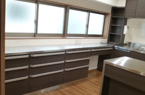 お料理好きの施主様のご要望で、間仕切りを取って広々としたL字型キッチンへリフォーム。ルックスだけでなく、機能や内部の構造、細かいパーツにまでこだわったシステムキッチンを導入しました。「建築士」と「キッチンスペシャリスト」の資格を併せ持ったアドバイザーが丁寧にご相談を承ります。